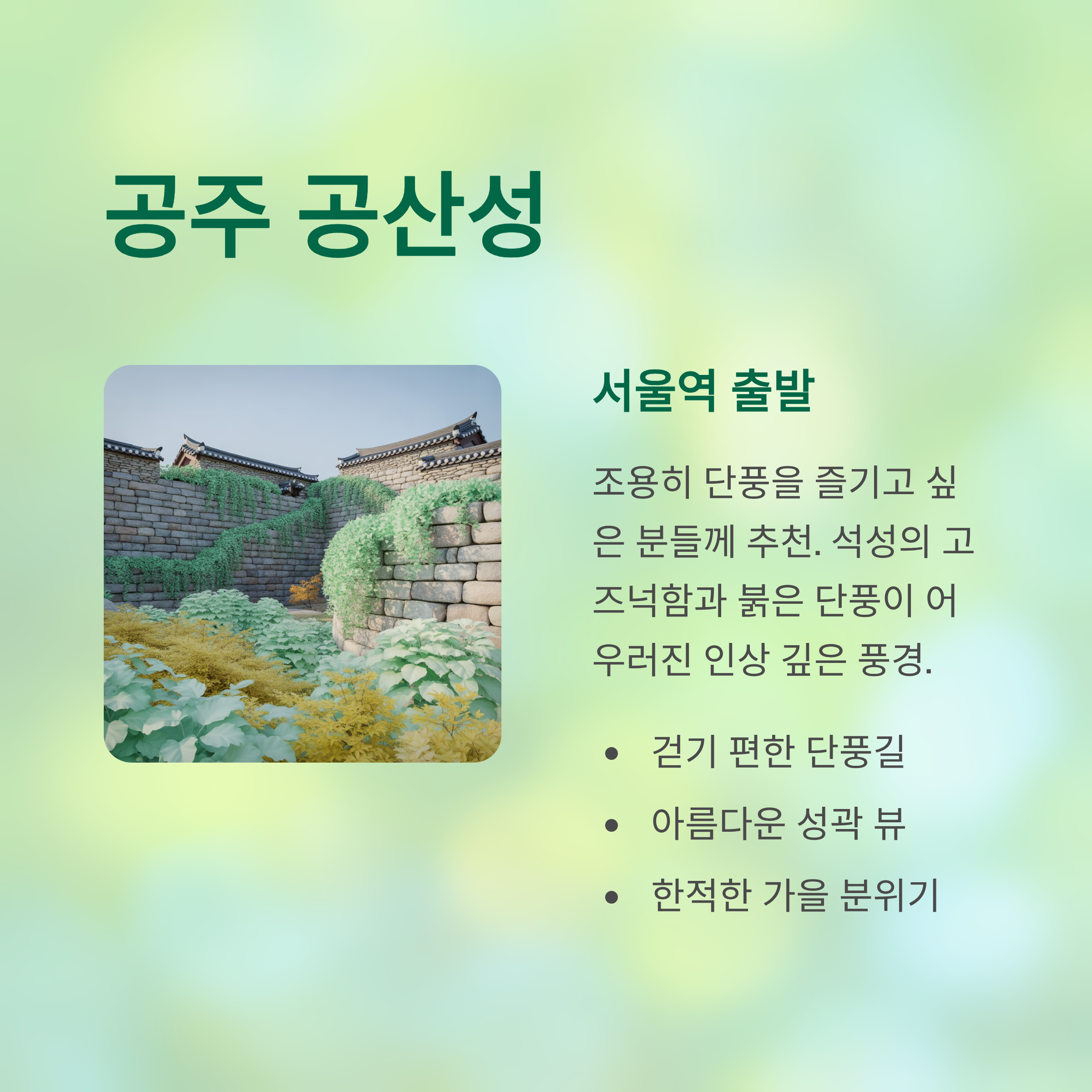 특히 공산성의 단풍길은 걷기 편하고 풍경도 아름다워요. 석성의 고즈넉함과 붉은 단풍이 어우러진 모습이 인상 깊죠.