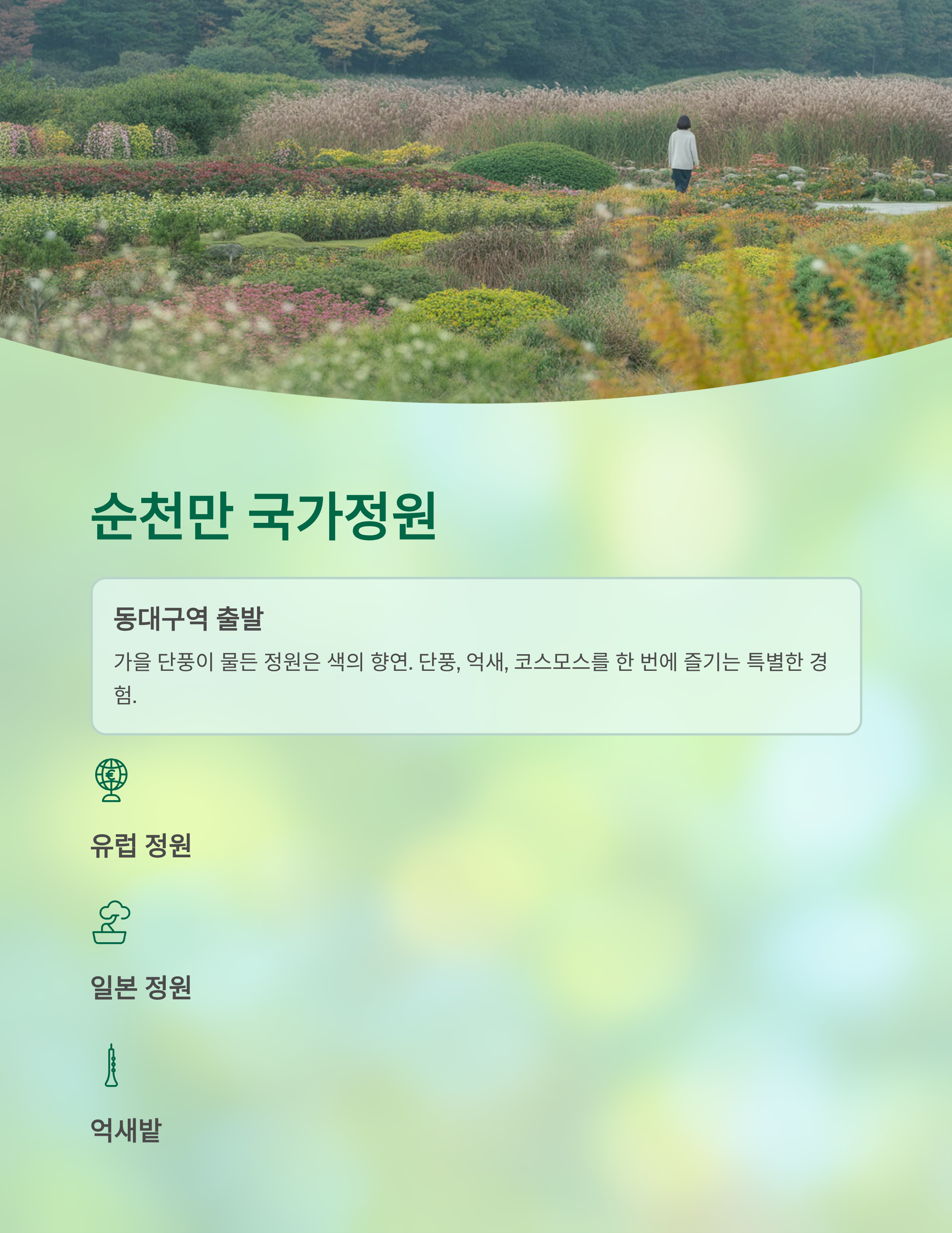 순천만 국가정원은 단풍뿐 아니라 억새, 코스모스까지 함께 즐길 수 있어요. 정원 내 유럽 정원, 일본 정원 등 다양한 테마존도 함께 즐기면 하루가 모자라요.
