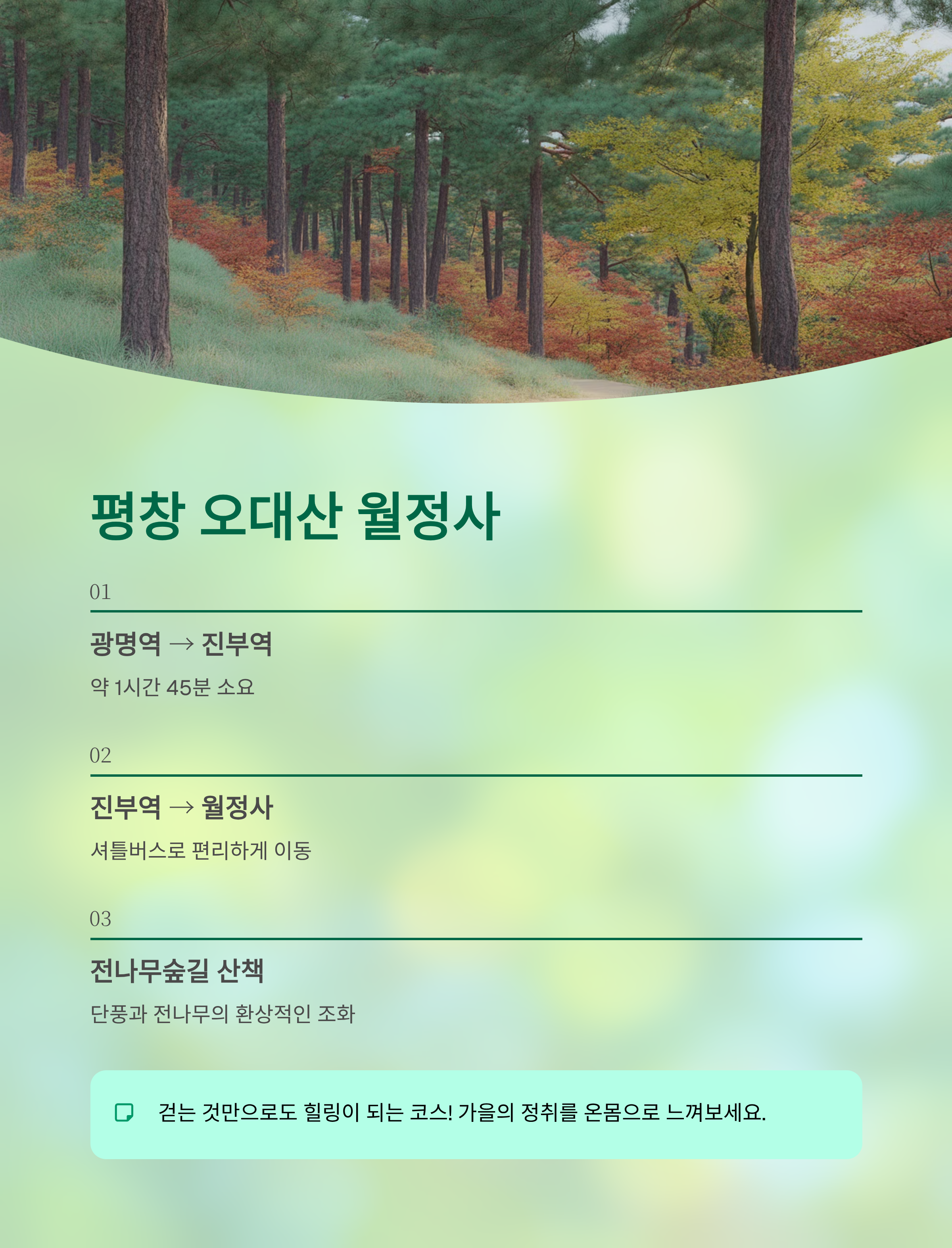 월정사 전나무숲길은 가을이면 단풍과 전나무가 조화를 이루며 환상적인 산책로로 변신해요. 걷는 것만으로도 힐링이 되는 코스죠.