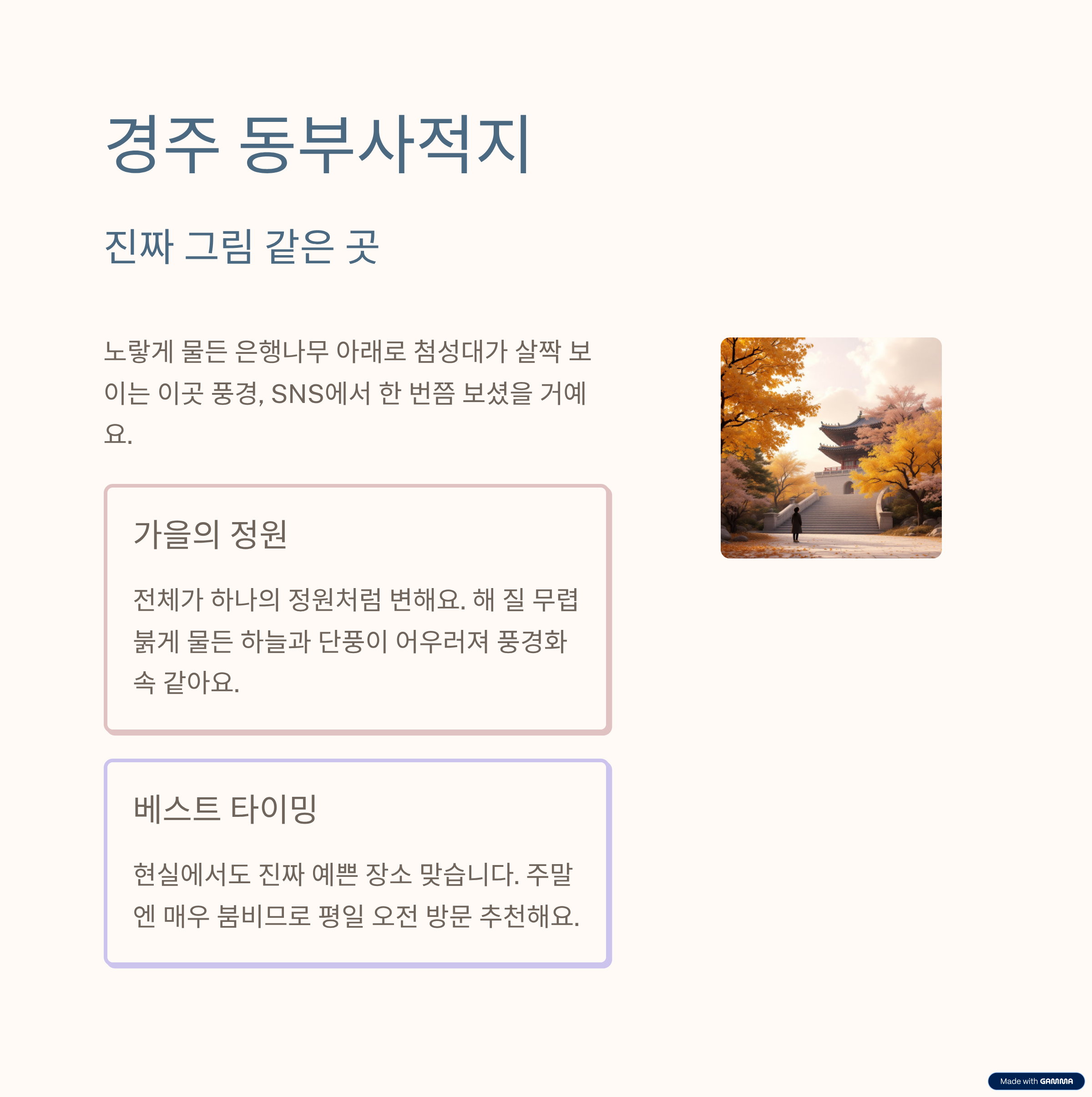 | 경주 동부사적지 | 정적인 역사+은행나무길 | 낮보단 석양 타임이 최고 |