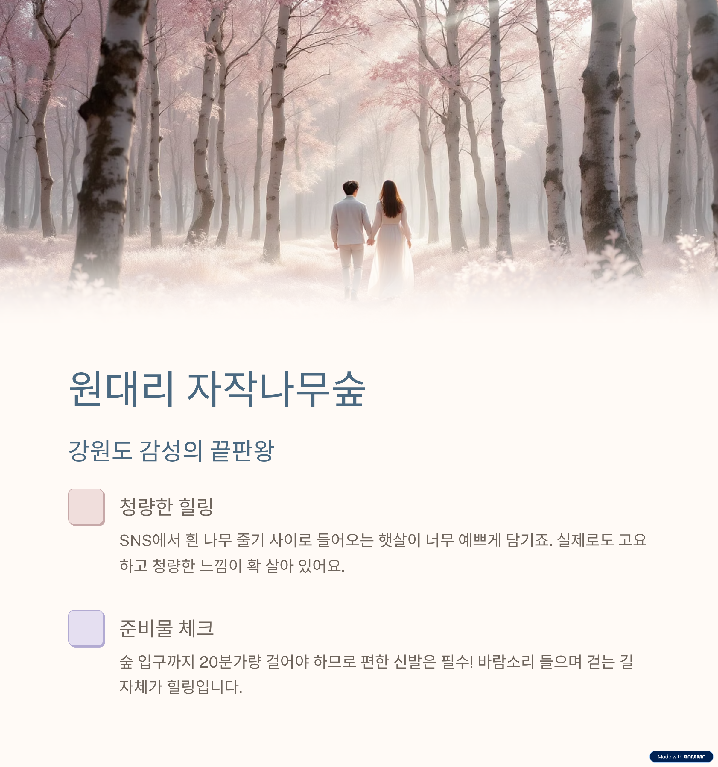 | 원대리 자작나무숲 | 신비롭고 청량한 숲 | 고요하고 걷기 좋지만 입구까지 거리 있음 |