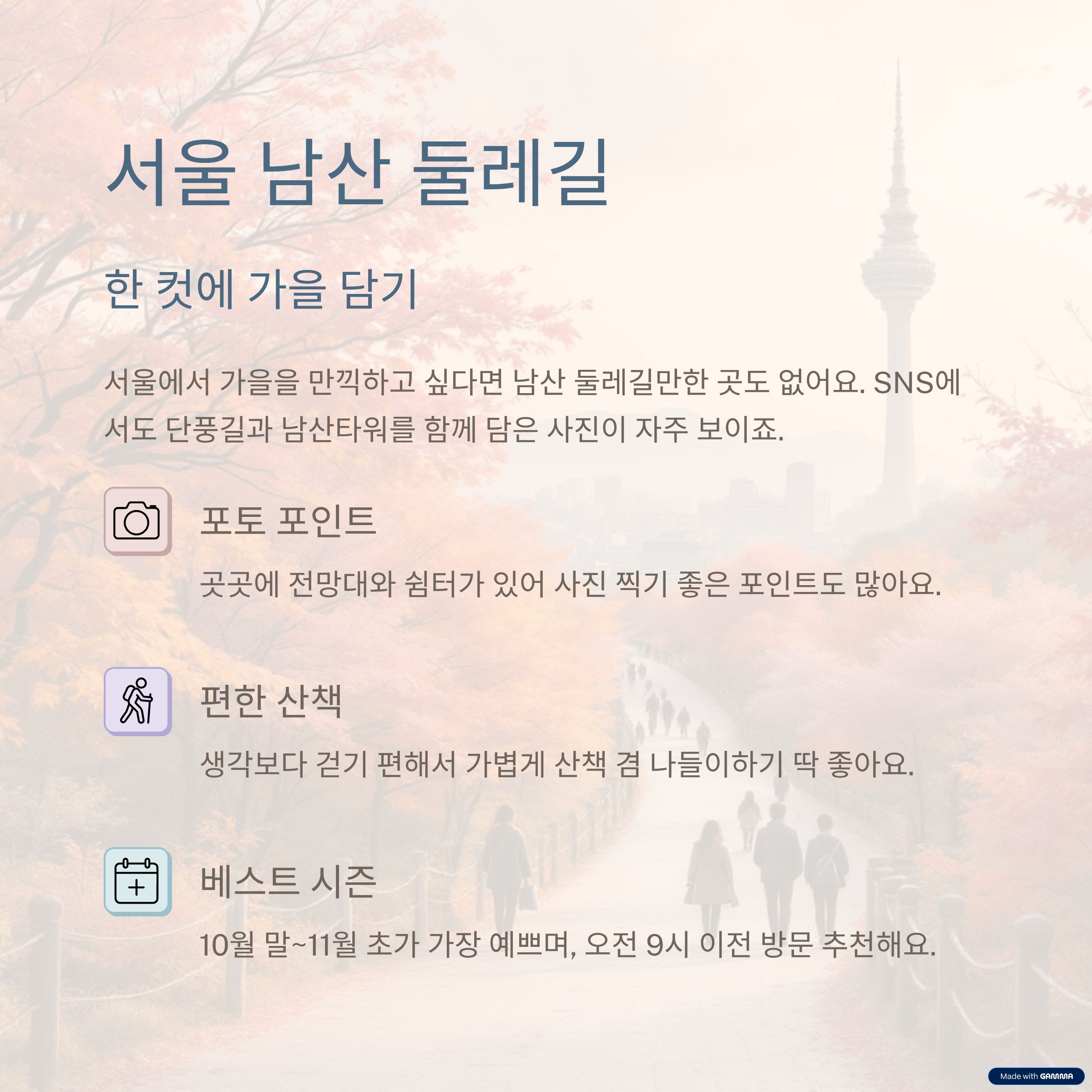 SNS에서도 단풍길과 남산타워를 함께 담은 사진이 자주 보이죠.