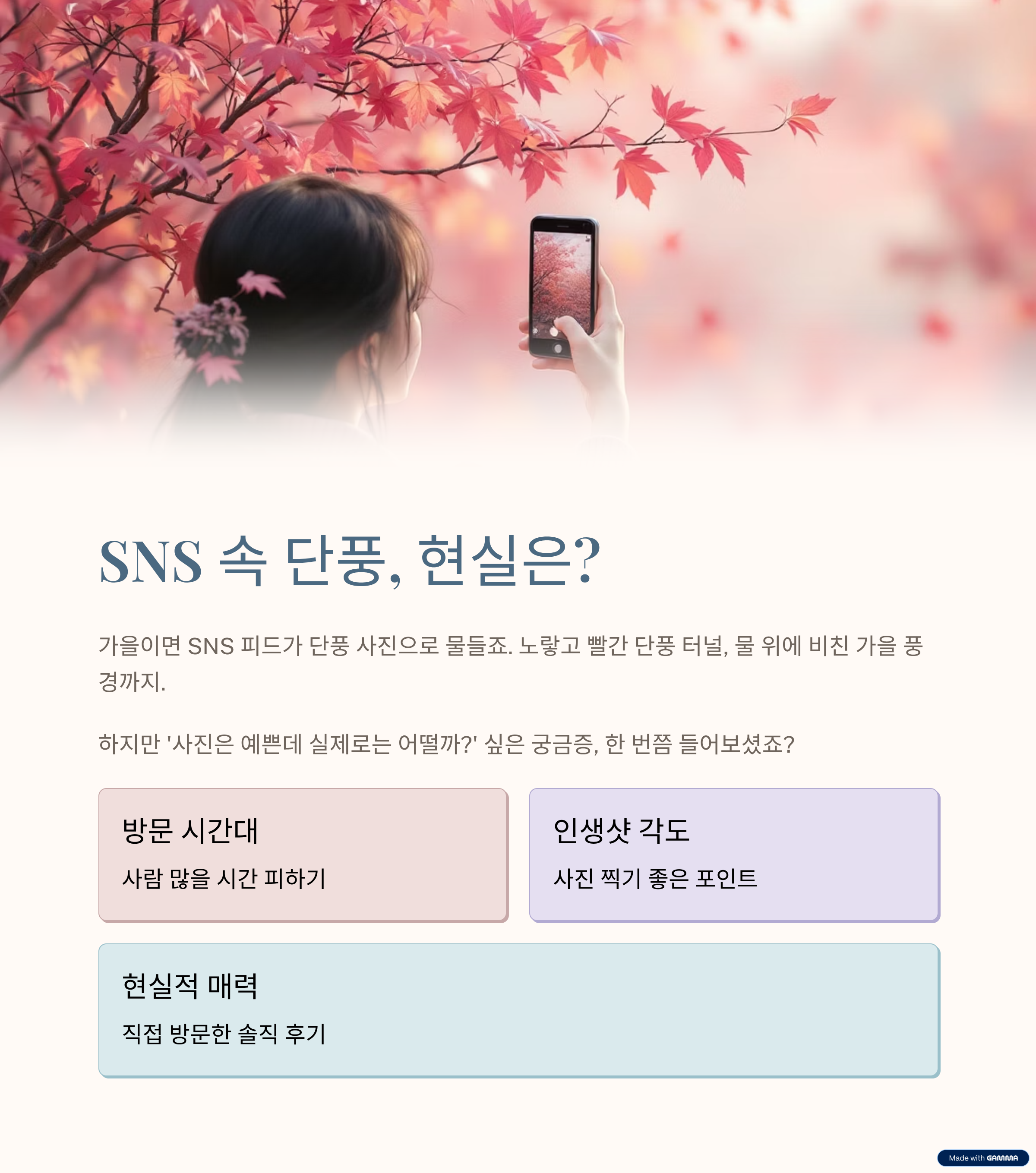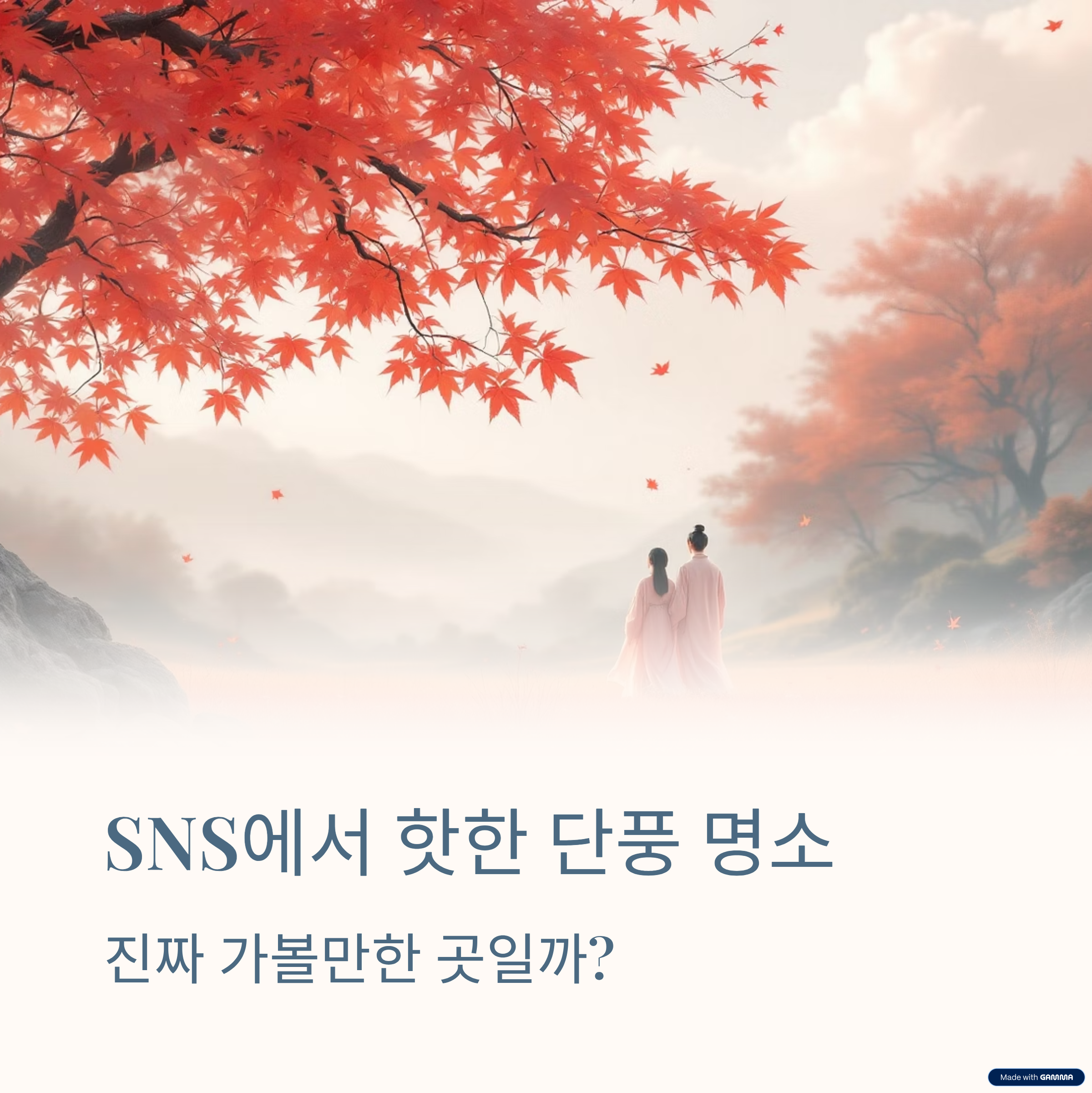 가을이면 SNS 피드가 단풍 사진으로 물들죠. 노랗고 빨간 단풍 터널, 물 위에 비친 가을 풍경, 감성 가득한 산책길까지.