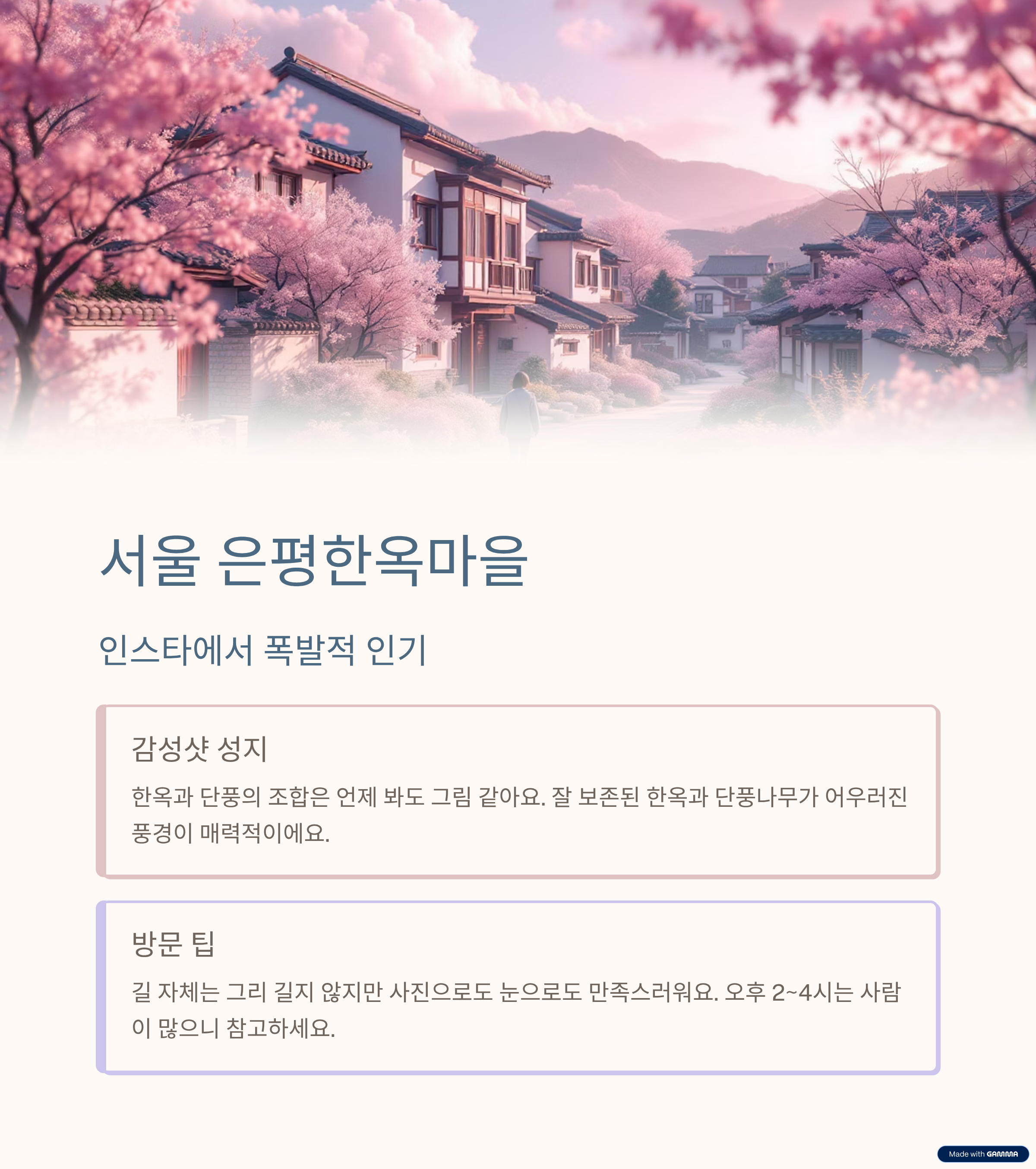 | 은평한옥마을 | 감성적인 한옥+단풍 | 예쁘지만 방문객 많고 규모 작음 |